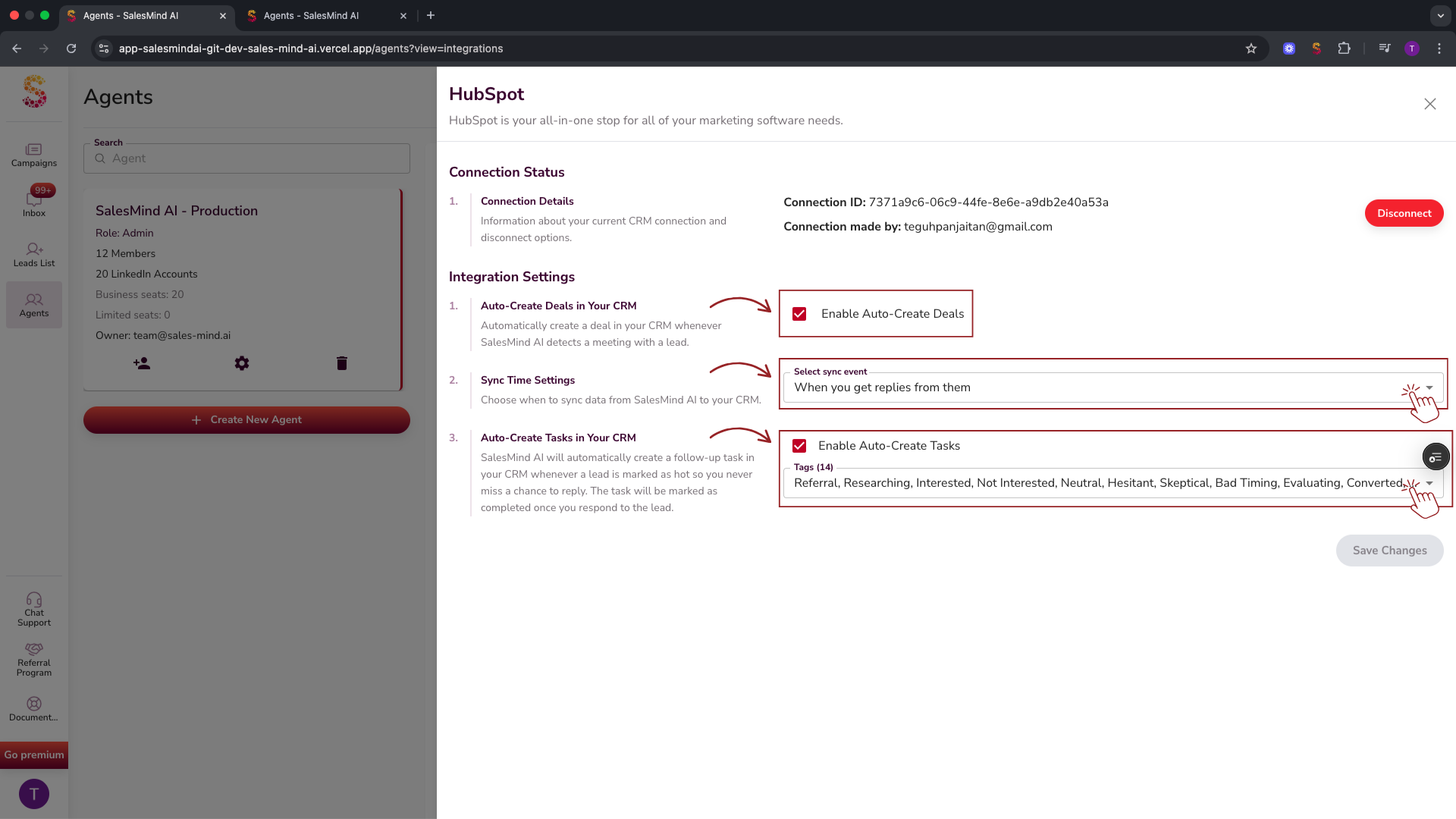 - Two-way Sync: With both HubSpot and Pipedrive, all lead information—including emails, messages, and new contact details—is now synchronized in both directions between your CRM and SalesMind AI.