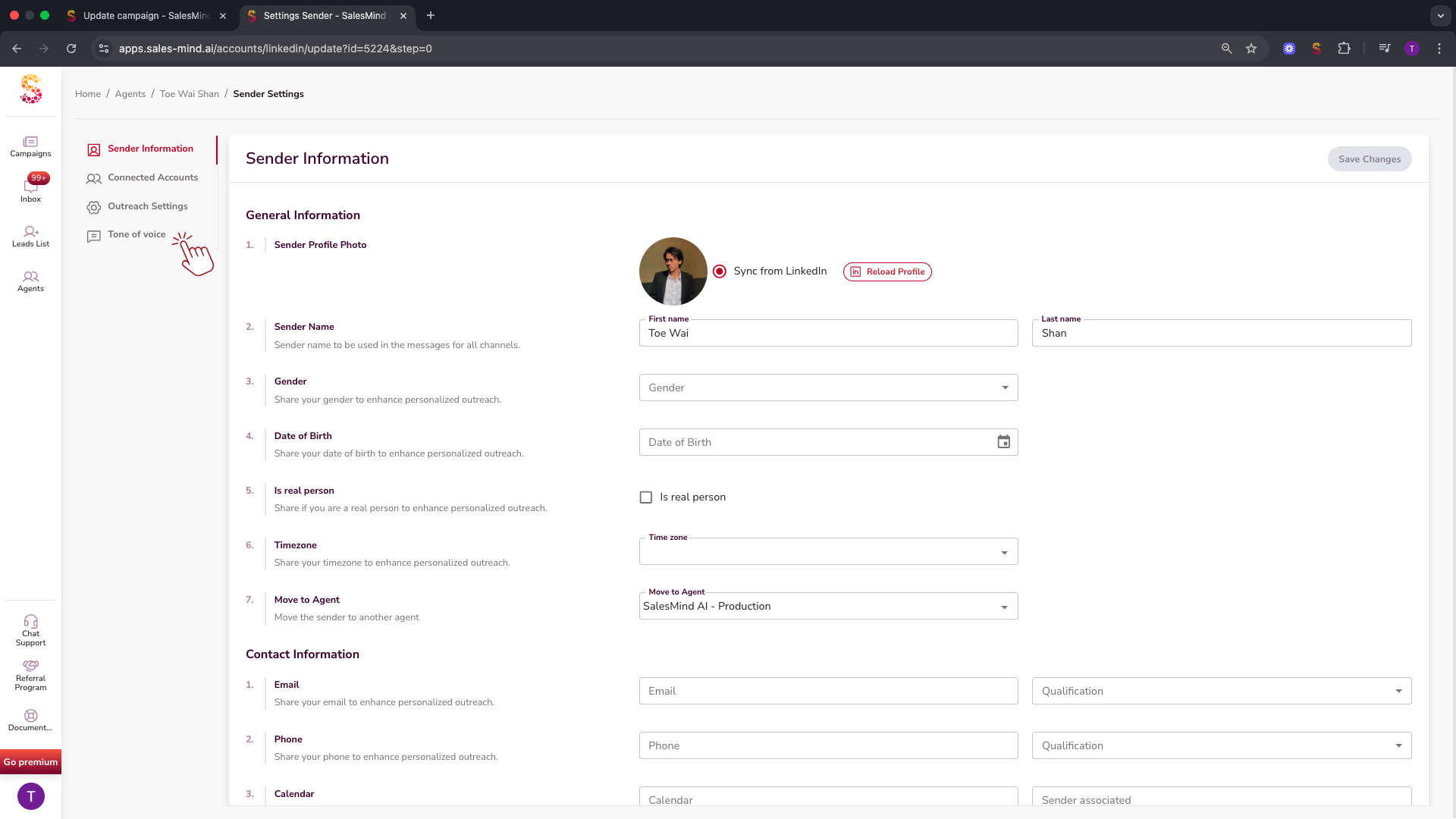 Go to Agent > Sender > Settings > Tone of Voice, and the AI will analyze your last 70 LinkedIn messages to mimic your tone for all initial outreach, replies, and nurturing sequences.