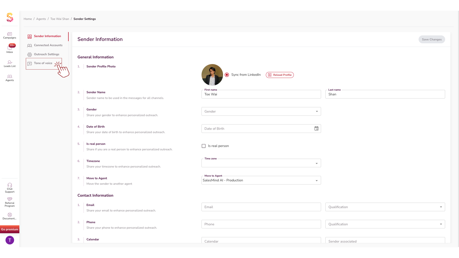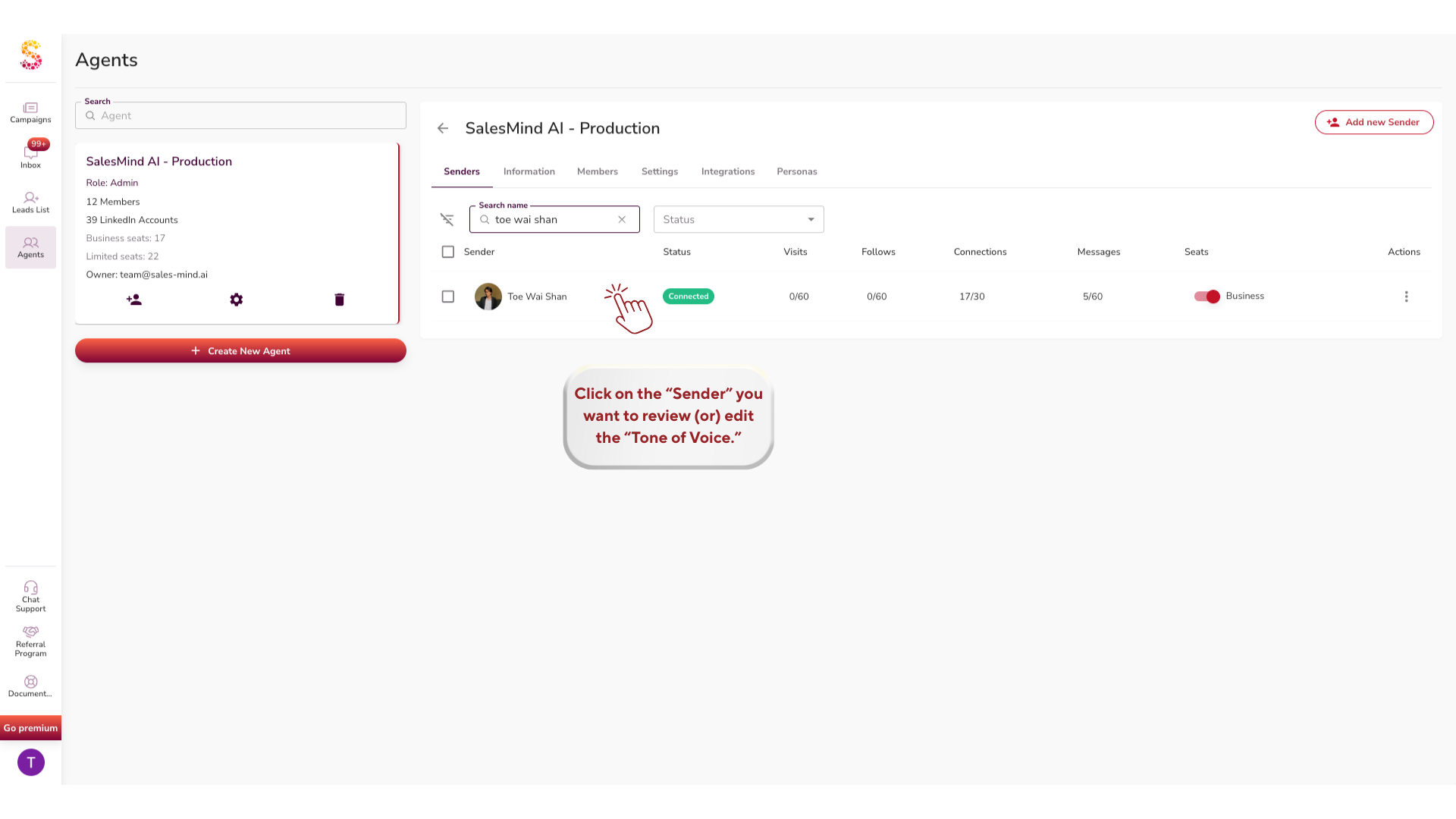 Go to your Agent settings on the left-hand menu. Click on the sender you want to edit.