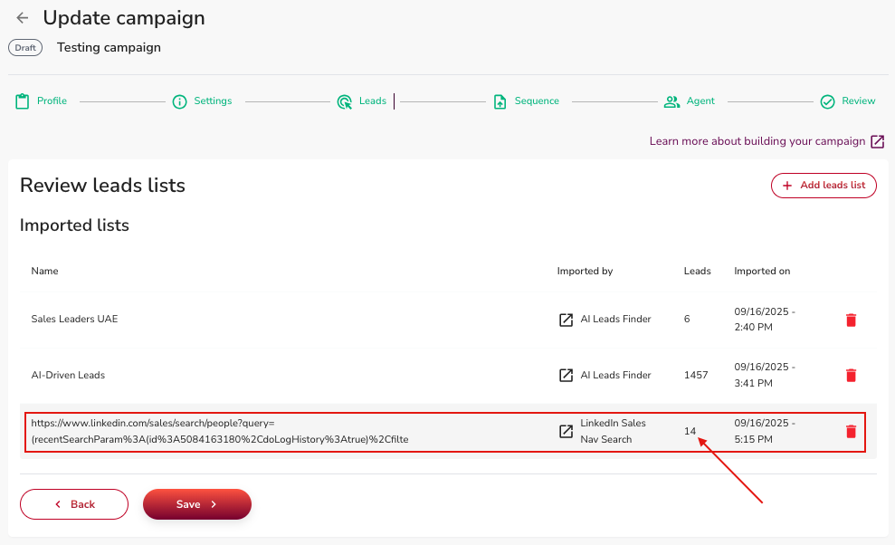 - After pasting the URL, SalesMind AI retrieves the results and imports them into your campaign.