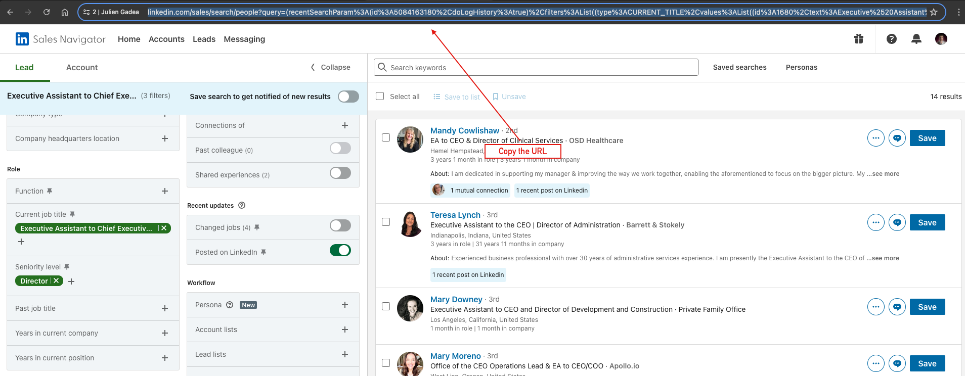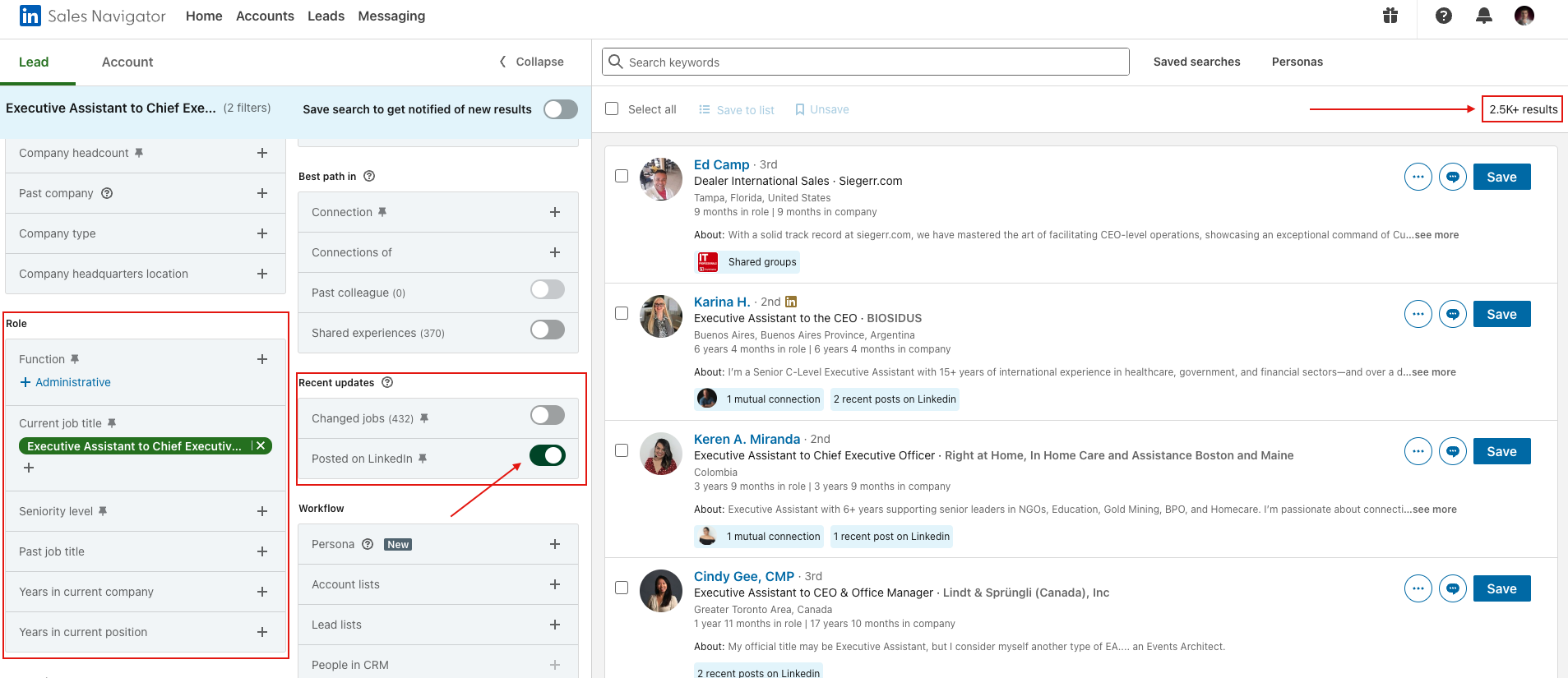👉 Example: 69,000 results may appear for “Executive Assistant to Chief Officer,” but only 2,500 might be active on LinkedIn. Activity filters help you find the people who will actually respond.