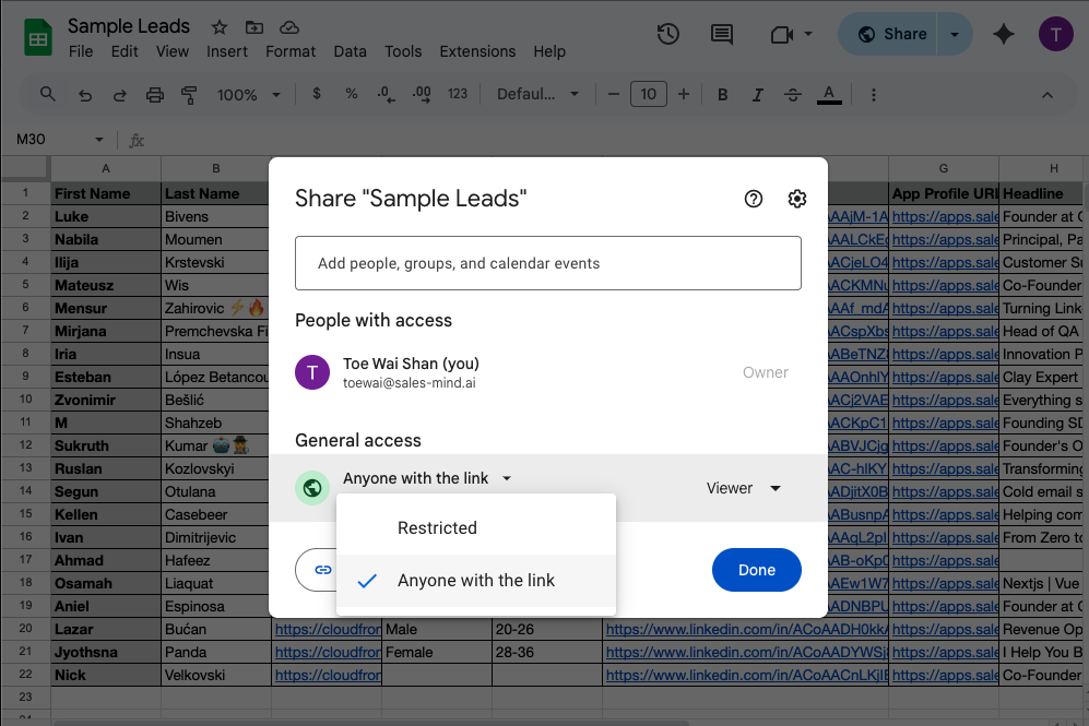 - SalesMind AI only reads the LinkedIn profile URLs. Any other columns (names, notes, emails, etc.) are ignored