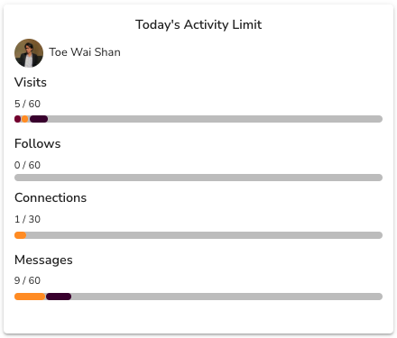 - Daily quotas apply per profile: 30 connections, 60 visits, 60 follows, 60–150 messages