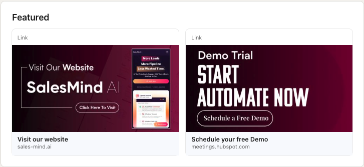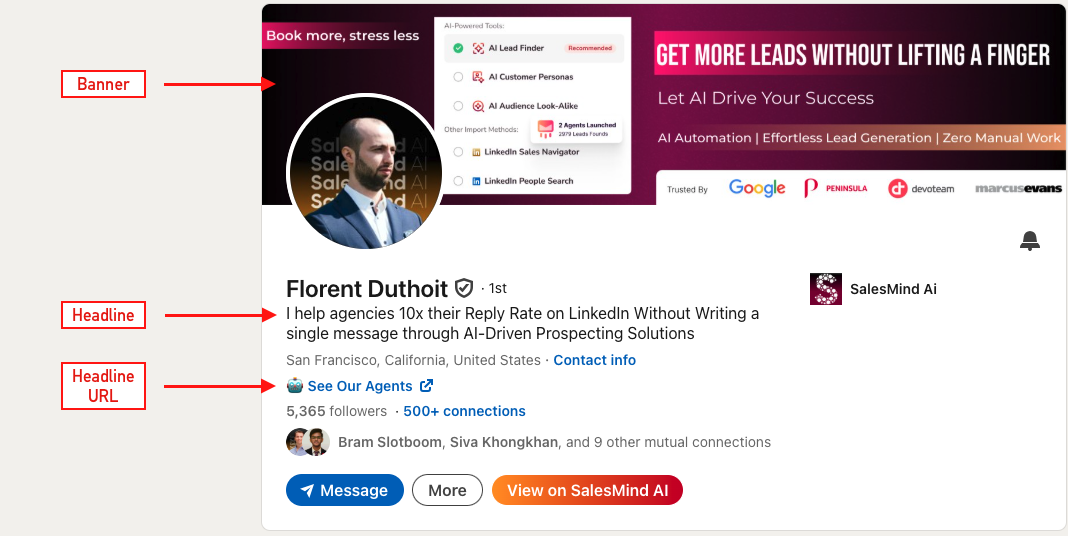 - Header URL (Profile link): Add a clickable link in your top card. Prefer a low-friction destination such as a website, case study, or value resource over a booking link. Visitors are often not ready to schedule a call yet, but they will click to learn more. Good examples: “See case studies,” “How it works,” “Get growth tips.”
