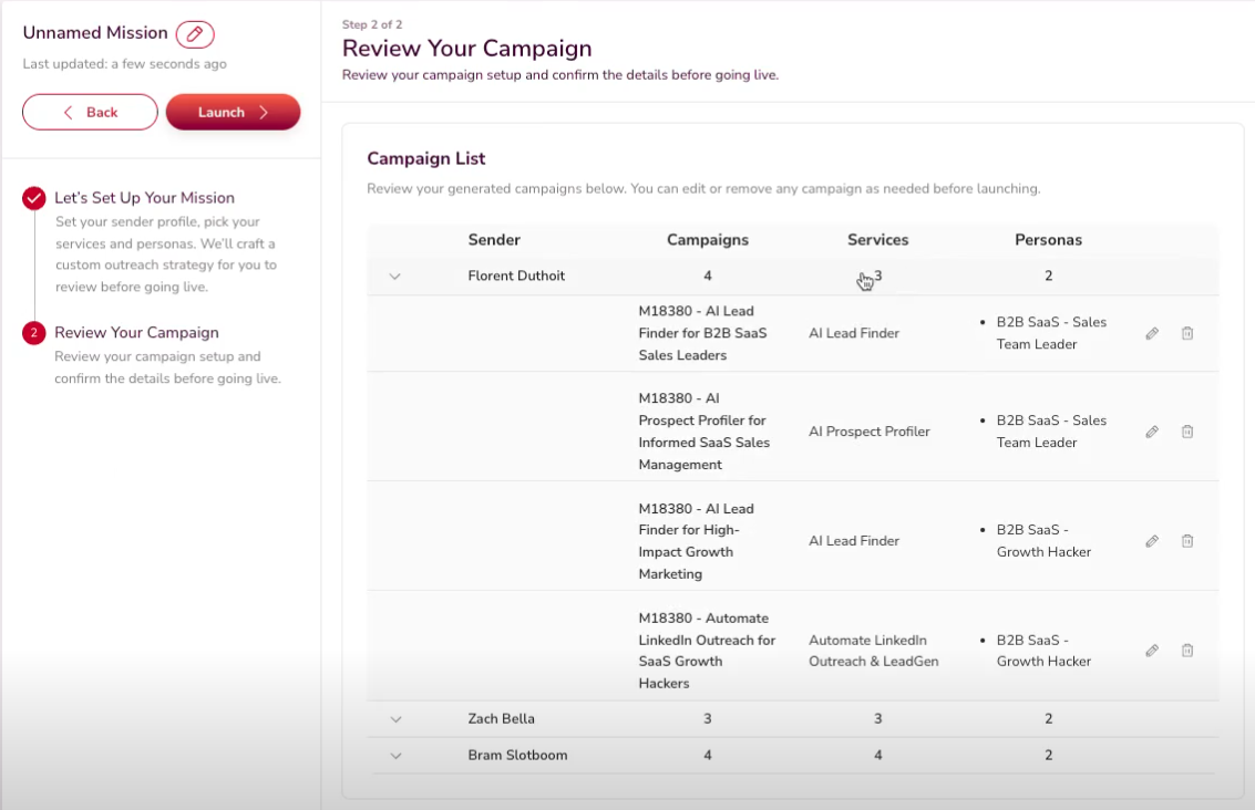 👉 These elements are defined when you create a Mission. You select the services you want to promote and the personas you want to target, then the AI generates campaigns that automatically include A/B/C tests.