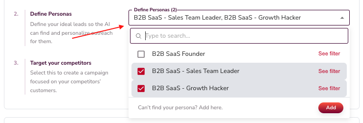 Select or edit personas that represent your target audiences. You can also add competitors for targeting. These personas define who the campaigns will reach.