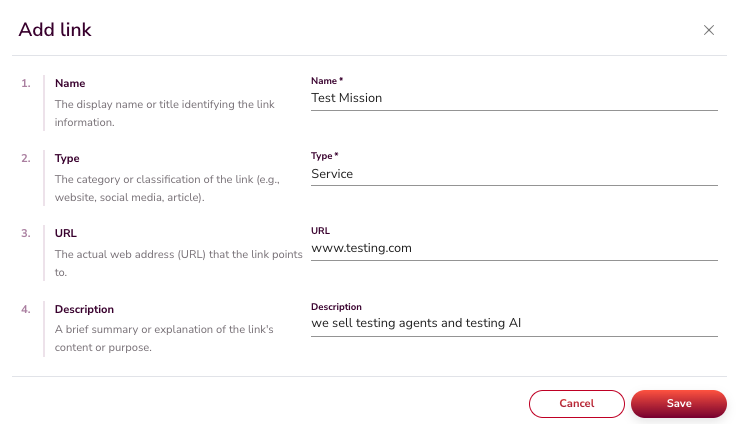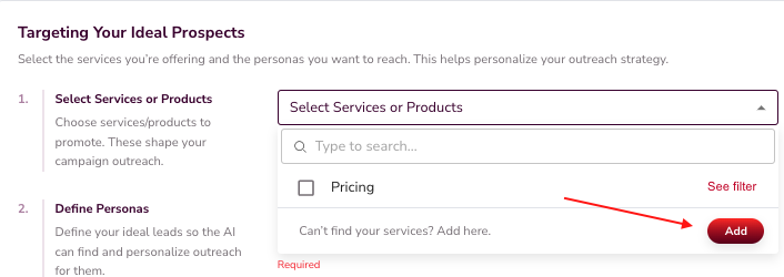 Add the products, features, or services the AI should promote. Each service should include: