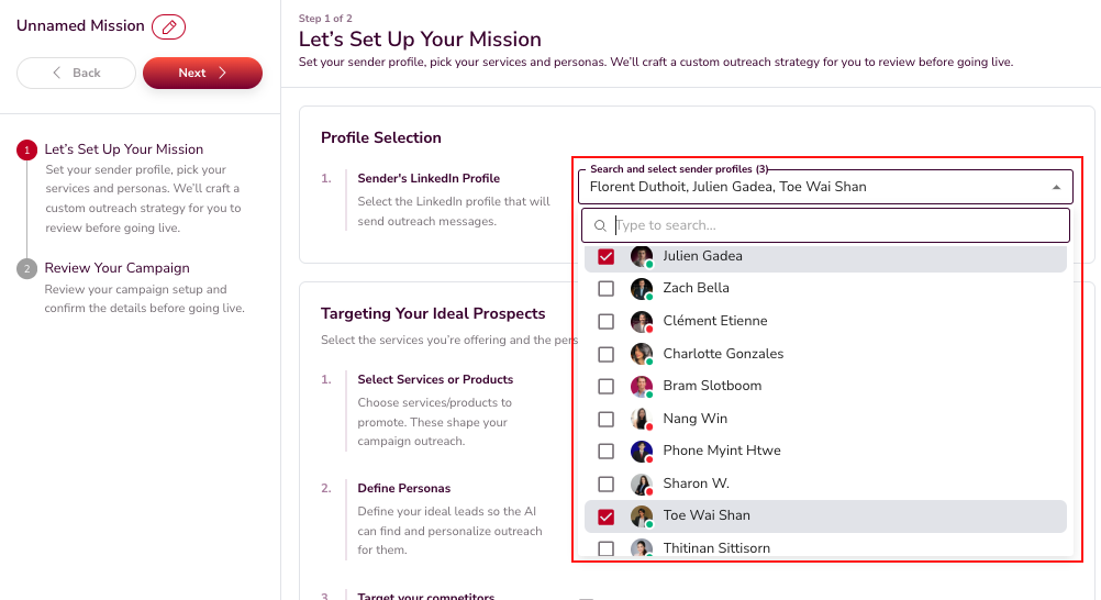 Choose which profiles (senders) will be used for the campaigns. Each profile represents a LinkedIn account that will handle outreach.