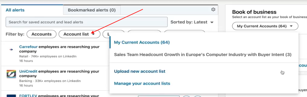 Account Hub gives you a single view of your lists, showing insights, recommended leads, and Buyer Intent data in one place. This helps you decide where to invest time and which accounts are most active or at risk.