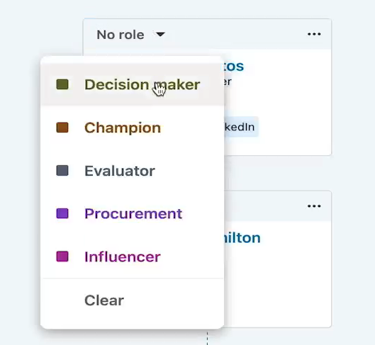 - Assign roles (Decision Maker, Influencer, Budget Holder, Champion, etc.).