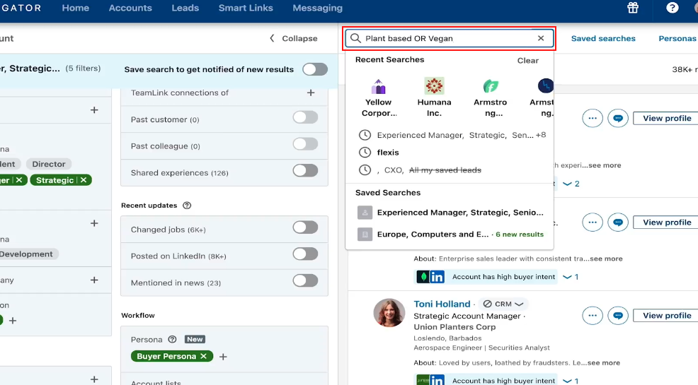 Sales Navigator lets you search profiles by keywords in their content or profile description. This is especially powerful for spotting leads aligned with your product’s themes.
