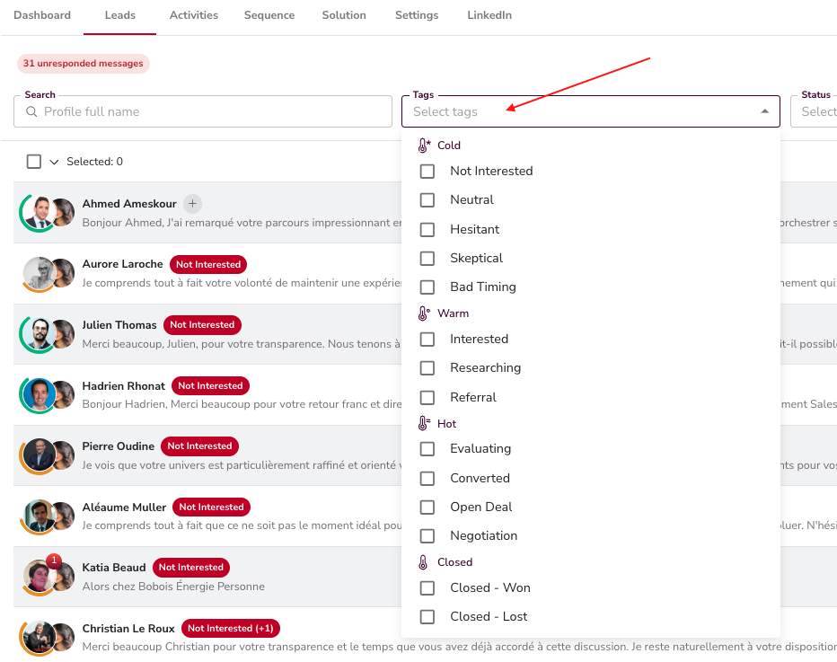 - You can filter the chats by Tags or Status.