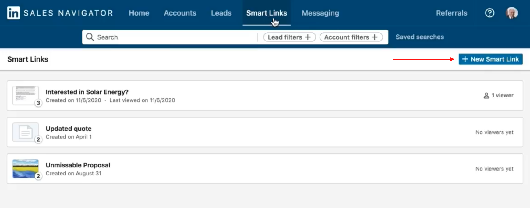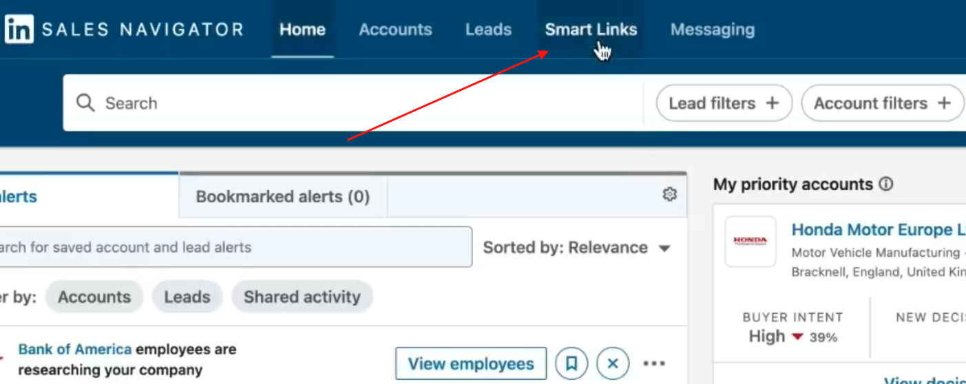 - Create a Smart Link by clicking Smart Links in the top toolbar of LinkedIn Sales Navigator.